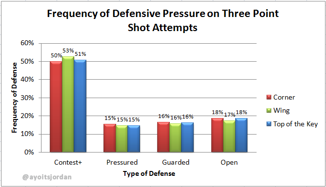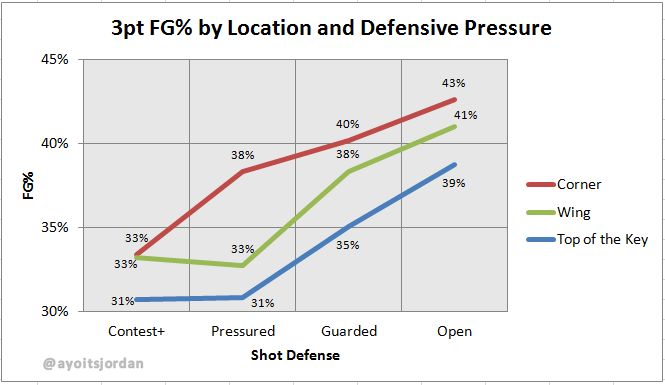 Conclusion Even after accounting for shooter movement and the strength of the defense, the corner three still comes out looking like the easiest three. The big difference with the short distance corner three comes when defenders aren’t playing strong defense. If a shot is launched from the wing or top of the key, the defense might be able to get away with not getting a hand up. But if that three-point attempt comes from the corner, anything but great defense can turn an average shooter into a 40+ percent shooter. http://blog.cacvantage.com/2013/02/How-Easy-Is-the-Corner-Three-Pointer-NBA-Defense.html |